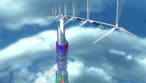 As said above a dirigible can be anchored to the upper end of the turbine’s spine. By being anchored in this way the entire shaft can rotate freely, adding its own motion to the rotors and thus adding greater power generation. The blimp itself could also be covered with solar cells- so that virtually everything is harnessing renewable energy.